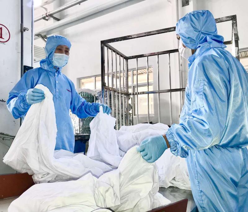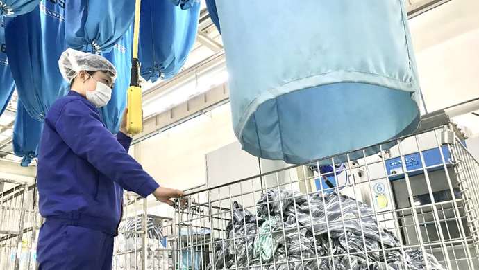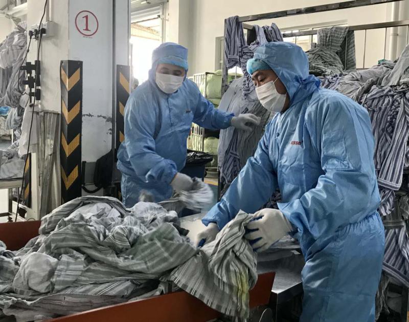 據(jù)他介紹,一方面,一般普通的臟污織物所經(jīng)歷的消毒包含洗滌過程中的化學(xué)消毒和濕熱消毒,以及干燥過程中的干熱消毒,通過利用隔離式洗衣機(jī)洗滌,幾輪化學(xué)加物理消毒下來,可以保障織物的清潔衛(wèi)生程度。對于重度污染的織物,甚至是感染性織物,消毒方式就更加嚴(yán)格了,無論從消毒劑的用量上,還是洗滌烘干的溫度上,都作了嚴(yán)的把控,以確保消毒質(zhì)量。