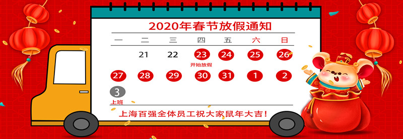 百?gòu)?qiáng)洗滌設(shè)備放假通知,現(xiàn)將2020年春節(jié)放假安排通知如下:1月23日至2月2日放假調(diào)休,共10天。2月3日(星期一)上班。節(jié)假日期間,公司除值班人員按照值班表做好值班工作之外,其他人員休息。
