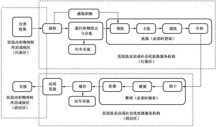 答:醫(yī)用洗衣房布局要求: 除了對洗滌要求以外,醫(yī)院的洗衣房內(nèi)部分布也是要求嚴格,主要分為兩個一個是污染區(qū)另一個是清潔區(qū)。洗衣房污染區(qū)與清潔區(qū)之間設置的全封閉式、實質(zhì)性隔斷,除分別開設通道門供人員進出和物品由污到潔運送外,兩區(qū)之間空氣不能對流。此外,在醫(yī)用織物洗滌消毒作業(yè)場所清潔區(qū)內(nèi)設置的半封閉式隔斷,其高度與寬度適應操作需要,空間空氣可以對流。污染區(qū)主要用來收集、分揀、清點、處理、清洗;非污染區(qū)則用來烘干、縫補、熨燙、折疊、儲存、發(fā)布、辦公等。洗衣房的通風情況也要良好,在運送布草的時候由污到潔,這個步驟不可倒過來,污染區(qū)和非污染區(qū)都要有明顯的標志。此外,污染區(qū)的洗衣機、車輛、地面等每日用有效氯含量500mg∕L消毒劑擦拭拖洗。清潔區(qū)烘干機、熨燙折疊設備、車輛、工作臺、桌椅、地面保持清潔,每日用清水拖擦一次,清潔區(qū)若被污染需隨時消毒。